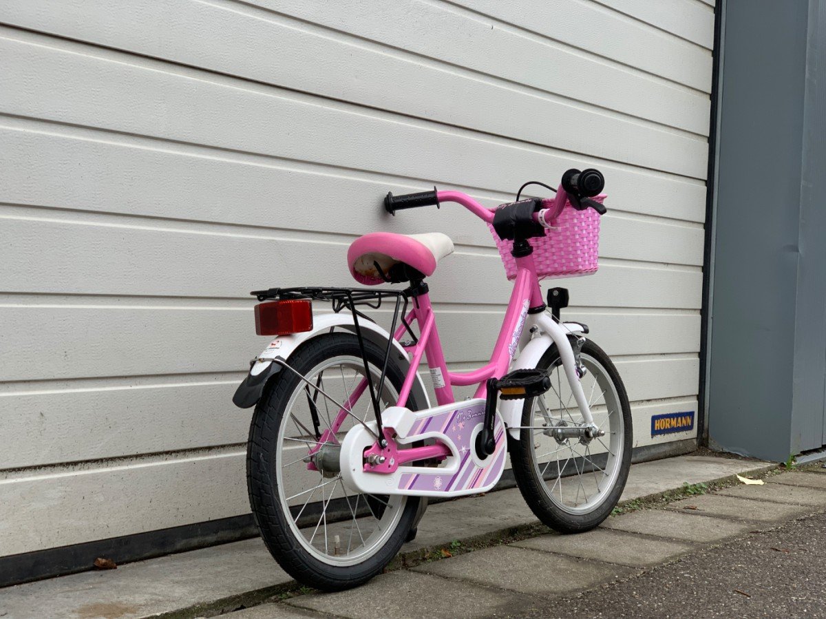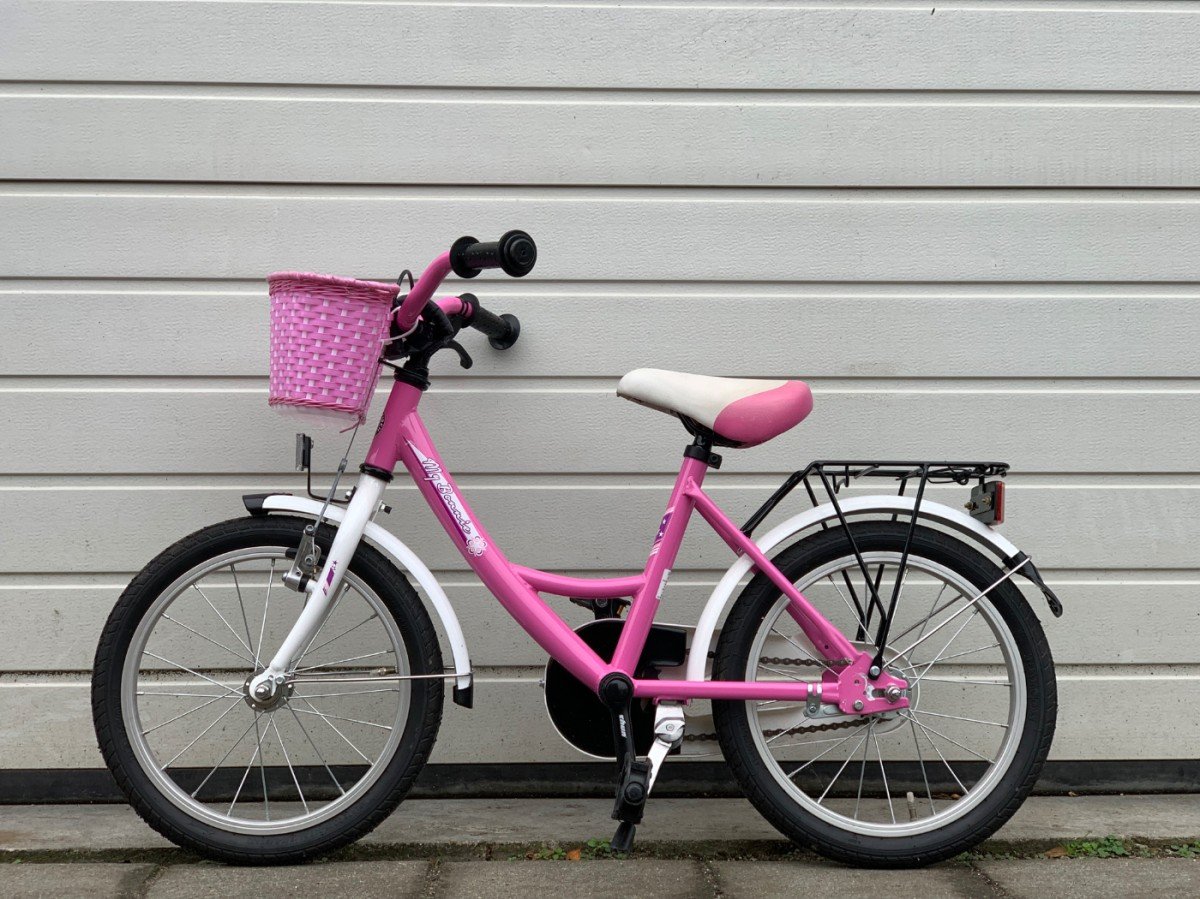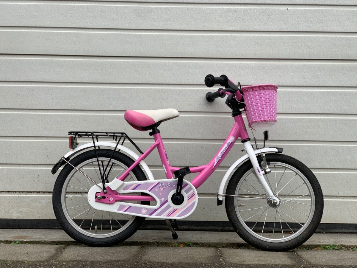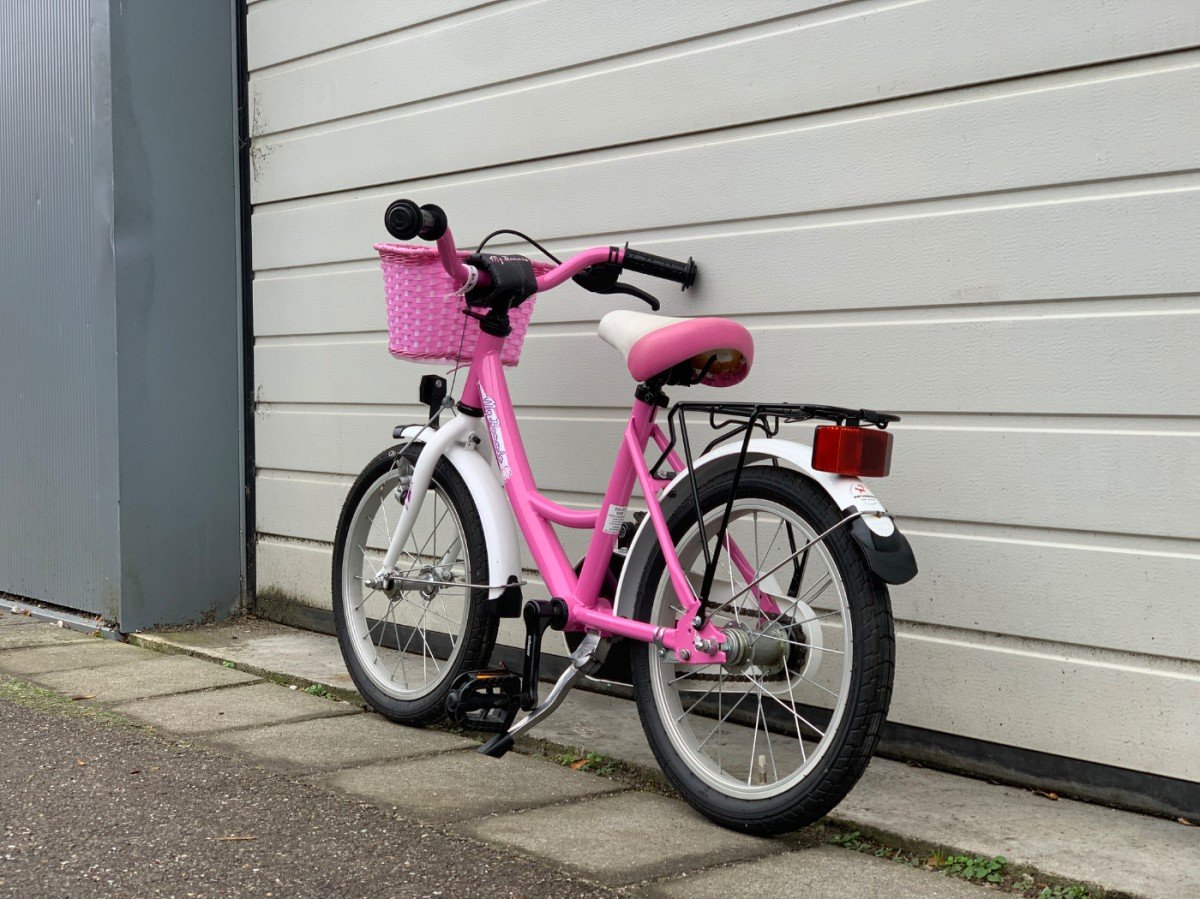Zo goed als nieuwe MY Bonnie roze 16inch kinderfiets met mandje, terugtraprem en handrem voor.