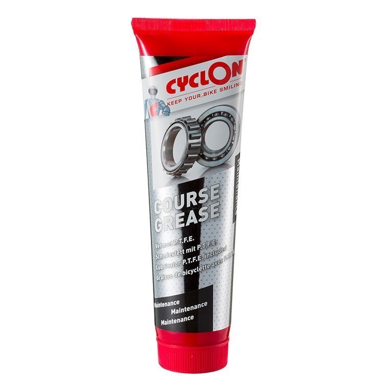 Cyclon Course Grease/Course Vet Tube 150ml. Sterk hechtend en PTFE houdend biologisch afbreekbaar lagervet. Vermindert de rolweerstand en is geschikt voor naven, lagers, balhoofden, stuurstangen en zadelpennen (tast geen rubber, plastic of lak aan). Verkrijgbaar in een 150ml tube en in een 500ml en 1000ml verpakking., 20046
